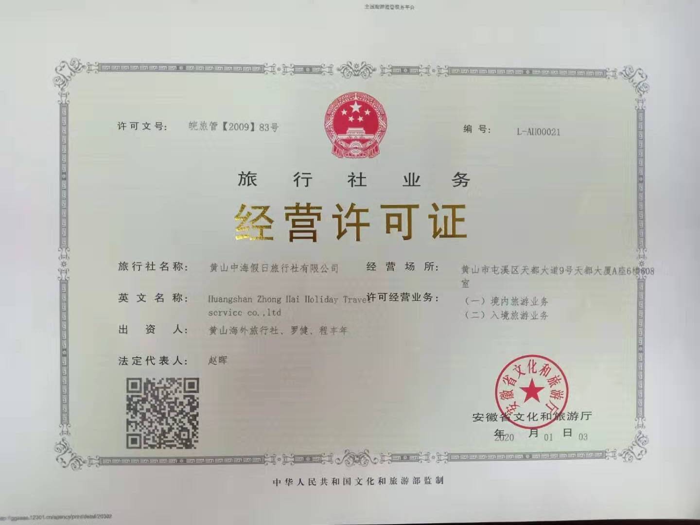 | 黄山中海假日旅行社有限公司 经营许可证L-AH00021 经营范围:入境旅游, 国内旅游 | |